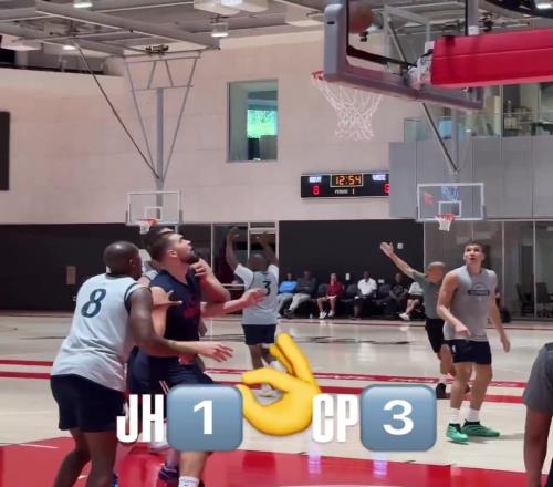 互不相让!哈登面对保罗飚进三分后者底角空位回敬一球